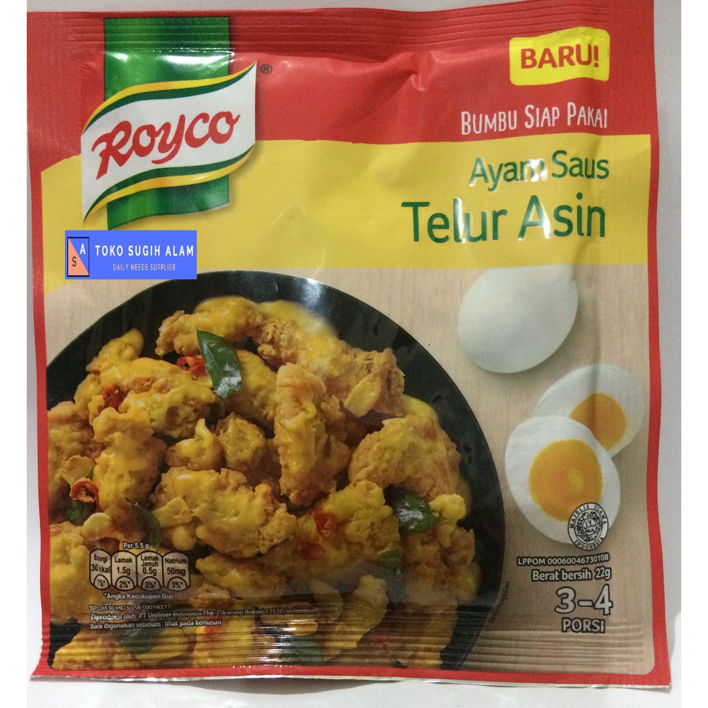 1 bungkus royco ayam saus telur asin. Royco bumbu siap pakai ayam saus telur asin merupakan sebuah racikan lengkap dari berbagai bumbu pilihan. Dibuat dari 100 rempah alami yang berkualitas dan tidak berpengawet bumbu ini hadir dalam kemasan 22 gram dan memiliki cita rasa khas masakan indonesia yang unik.